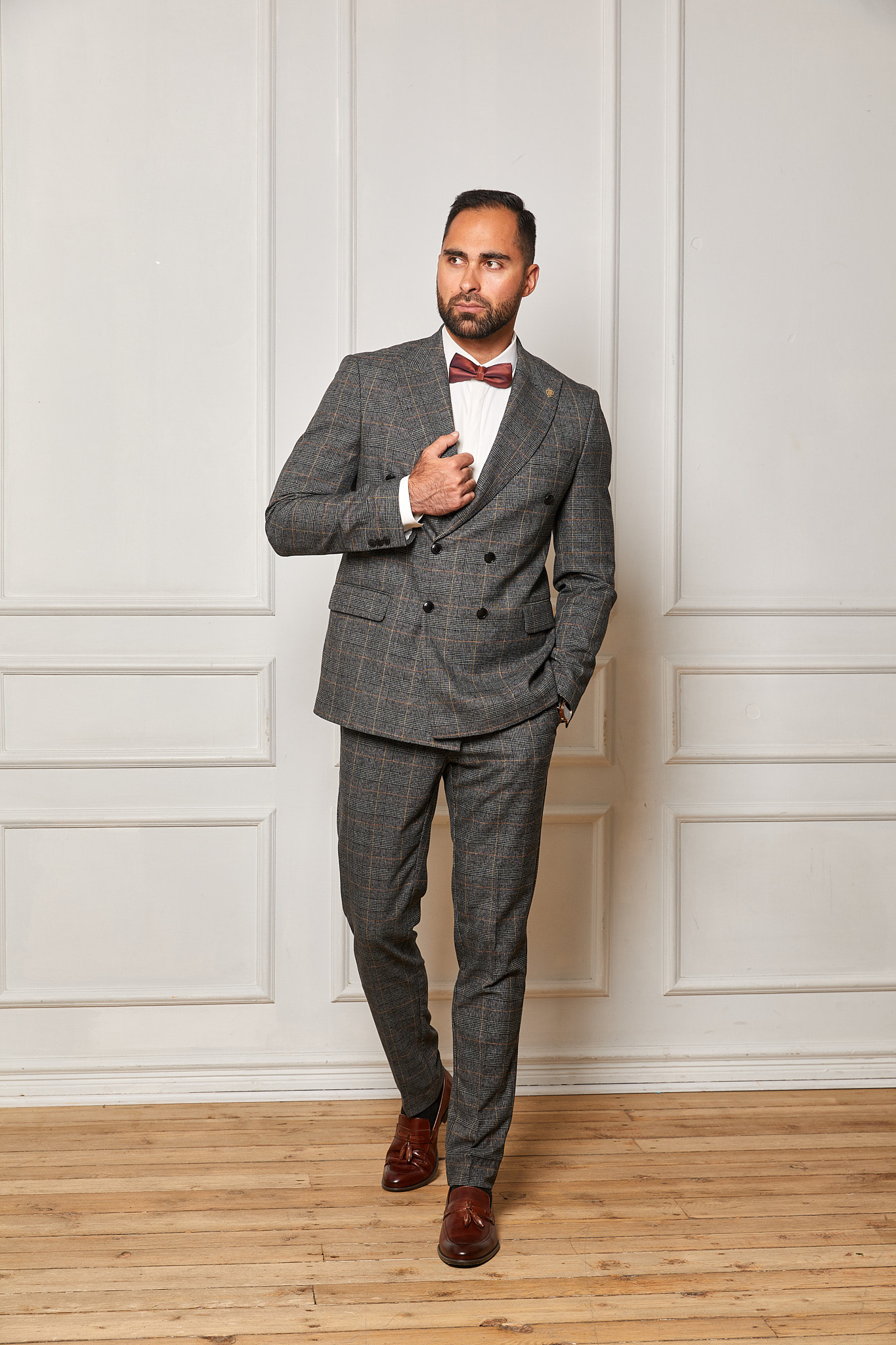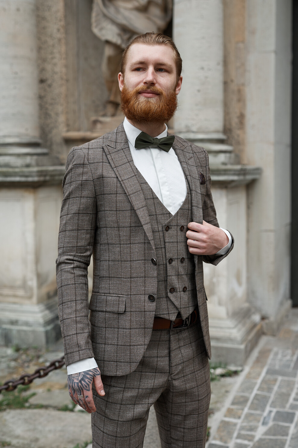 Neordināra rūtiņa un drosmīgs uzvalka dizains piešķirs toni visam tēlam. Papildus akcentējošie elementi vairs nebūs nepieciešami – efektīgs trijnieks ir pašpietiekams tērps.